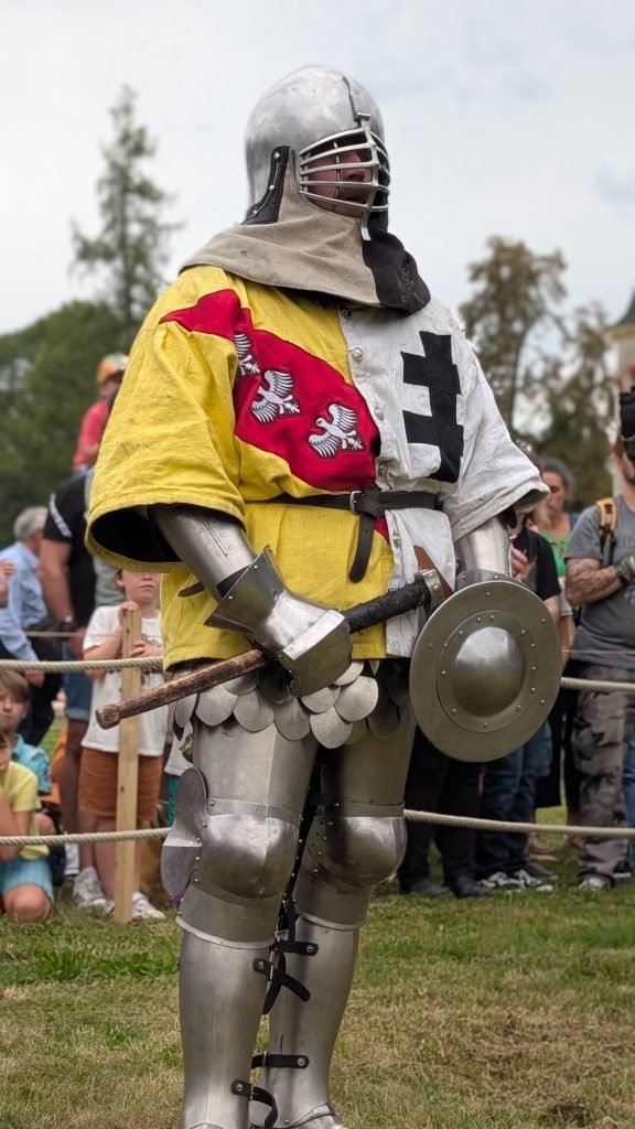- des armes et boucliers homologués, comme la hache, la masse, l’épée à une main ou le fauchon. Toutes les armes sont émoussées mais conçues pour résister aux impacts réels.