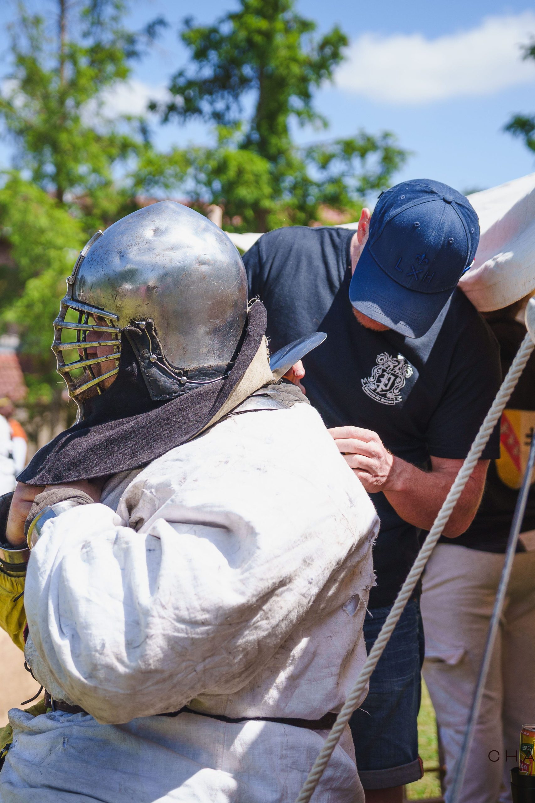 Soutien logistique, technique, parfois émotionnel et même infirmier, les écuyers sont des membres indispensables d’une équipe de béhourd pour le bon déroulement des interventions de l’équipe.